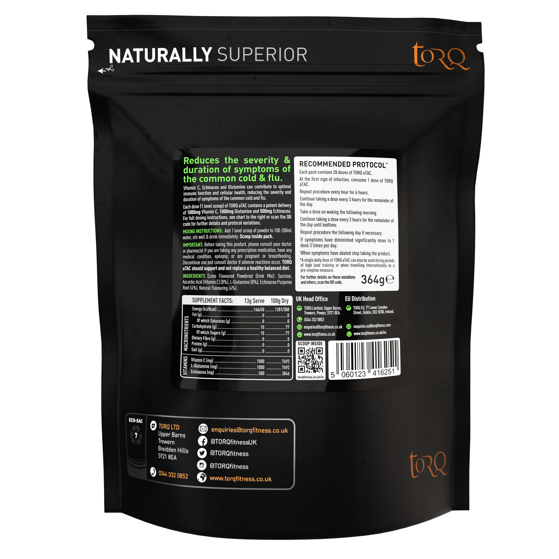TORQ aTAC es una bebida preparada en polvo disponible en 2 sabores (naranja y lima) que se añade a 100-200 ml de agua y se consume ante los primeros síntomas de fiebre, resfriado o gripe. Este producto también se puede usar en dosis más